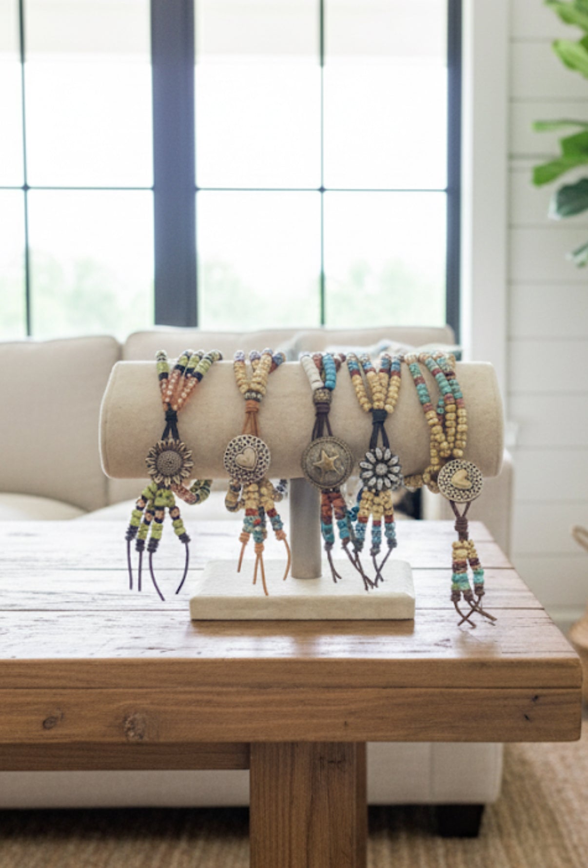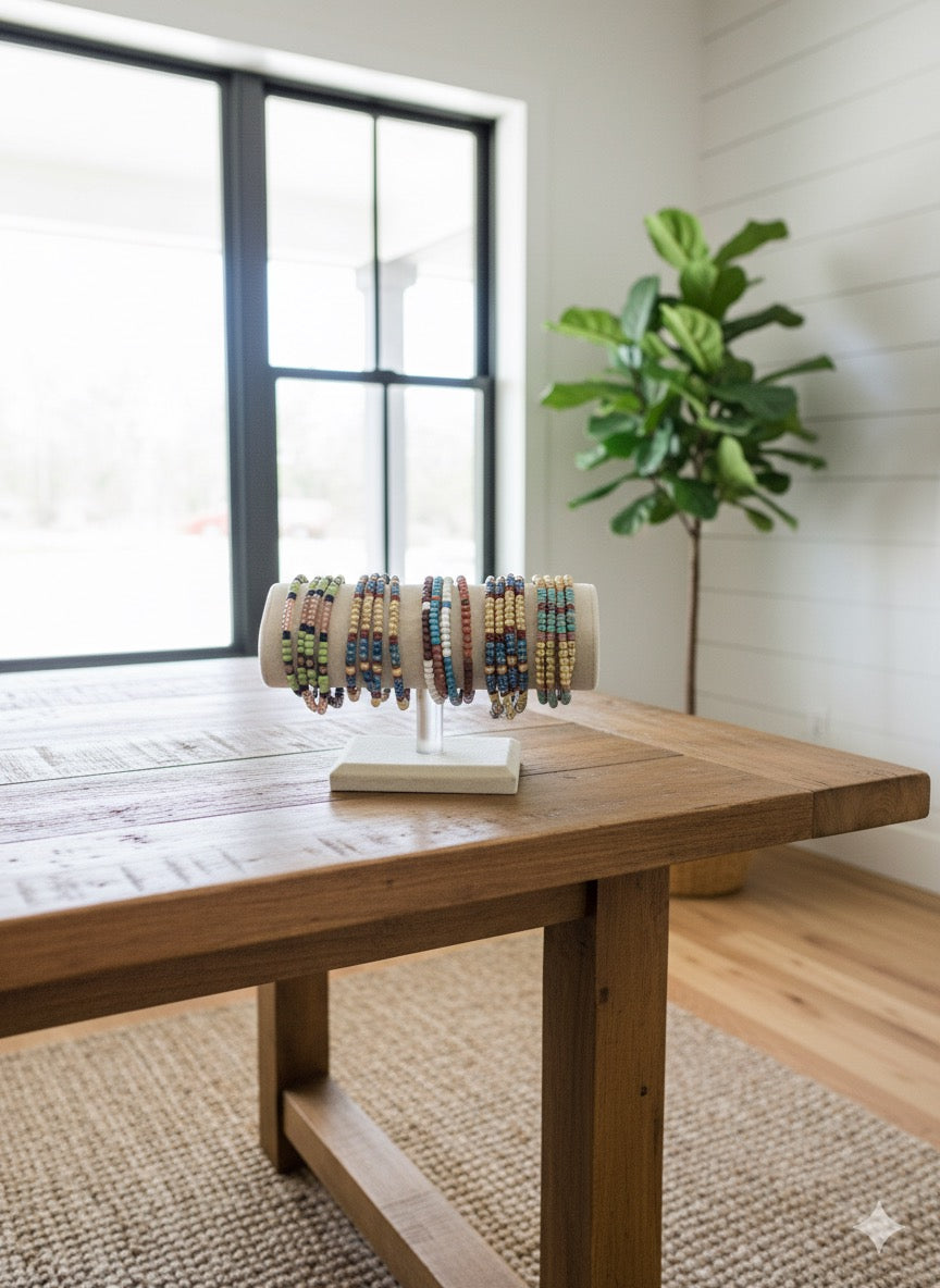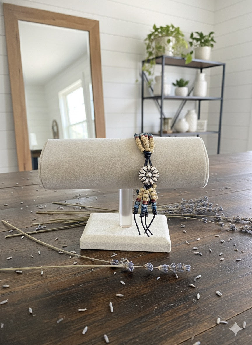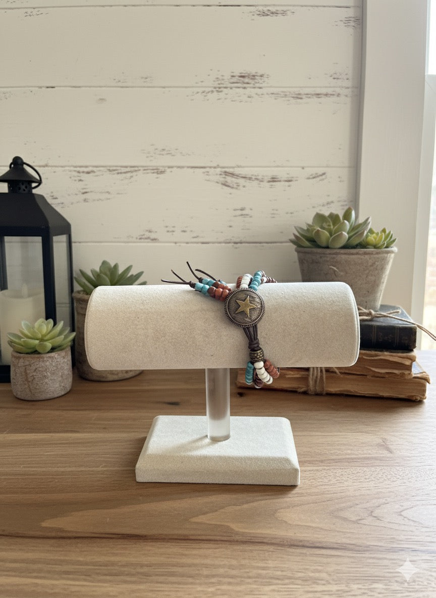 Handcrafted with genuine leather cording and intricate beadwork, this four-strand bracelet brings Western charm to your wrist. Each piece features a distinctive pendant button closure and earthy tones that blend beautifully together. Made by hand with care, it's as unique as you are—and makes a thoughtful gift for anyone who loves artisan accessories with personality.