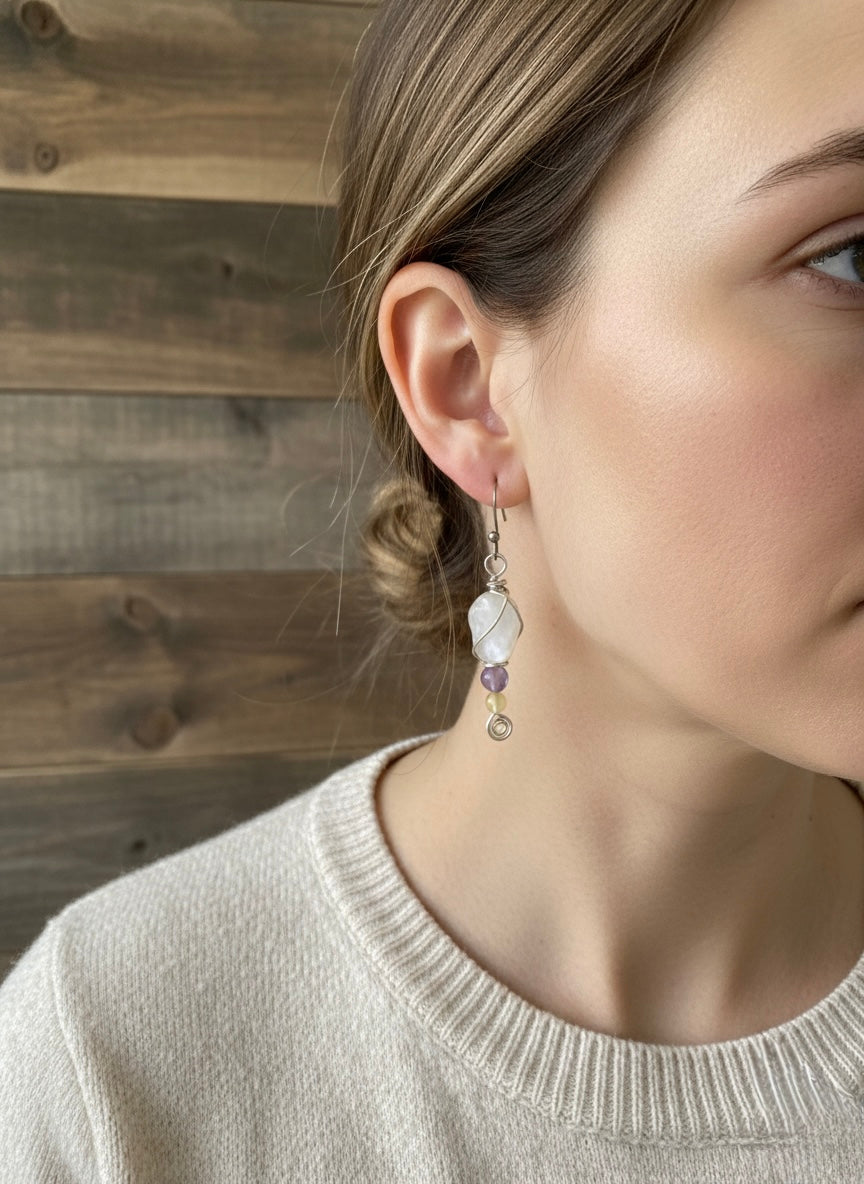 Hand-wrapped white stones meet delicate silver-toned wire in these charming rustic earrings. Soft purple and honey-yellow beads add a playful pop of color, while an artisanal wire-swirl detail brings bohemian flair. Lightweight and comfortable for all-day wear, they're perfect for anyone who loves natural beauty with a refined twist. Effortlessly versatile—dress them up or down.