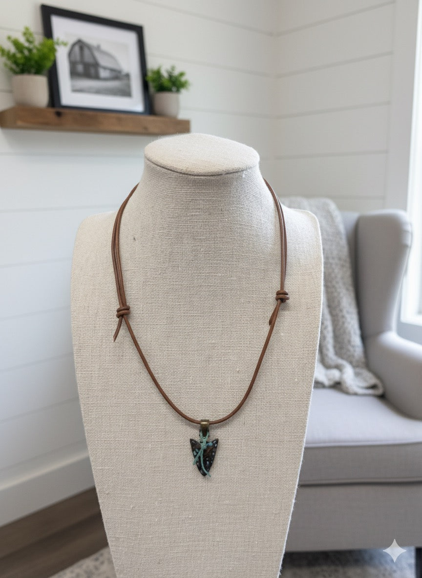 Add a touch of western elegance to any outfit with our Savanah Genuine Leather Necklace. The delicate and dainty design features a turquoise embellished metal arrowhead, and a dainty turquoise leather tie. Perfect for layering with other necklaces. A must-have for adding a unique flair to your wardrobe. Handcrafted by a local artist right here in South Dakota.