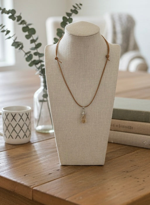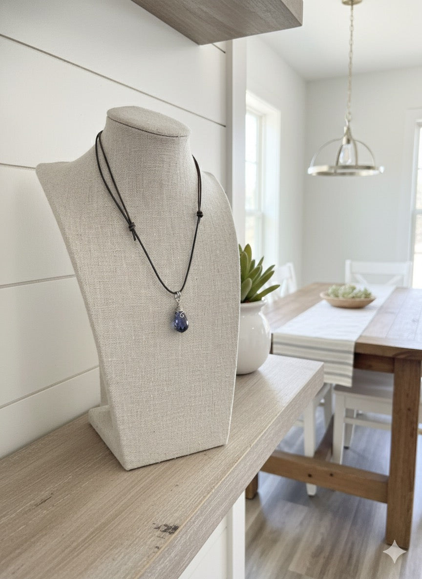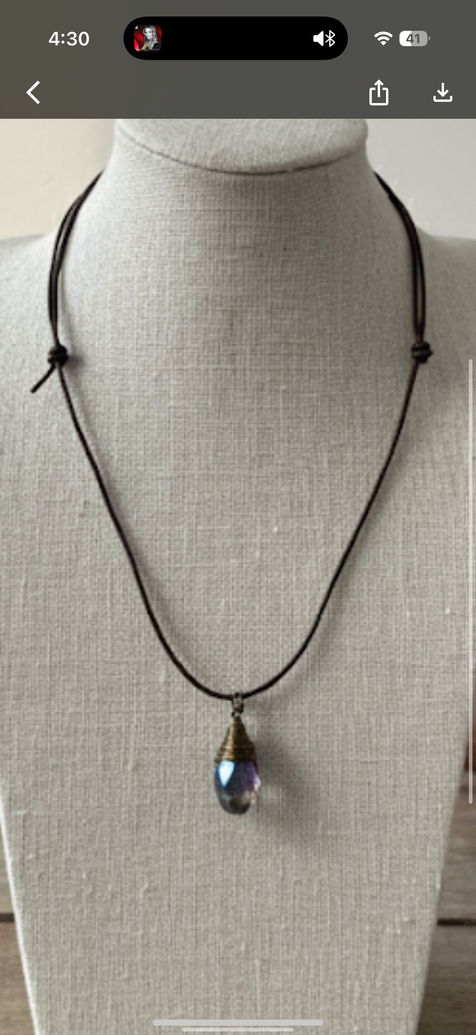 Introducing the Evelynn Teardrop Leather Necklace—where rustic charm meets effortless elegance. This beauty features a genuine leather cord adorned with charming slip knot details, paired with a luminous teardrop pendant that sparkles with every movement. The delicate wire-wrapped setting adds a touch of artisanal flair, while the adjustable cord ensures the perfect fit for any neckline. Minimalist yet bohemian, this necklace is your new go-to for layering or wearing solo. Versatile enough for everyday wear and special enough to turn heads, it's the kind of piece that feels like a little luxury you deserve. Perfect for layering with other necklaces. Handcrafted by a local artist right here in South Dakota.
