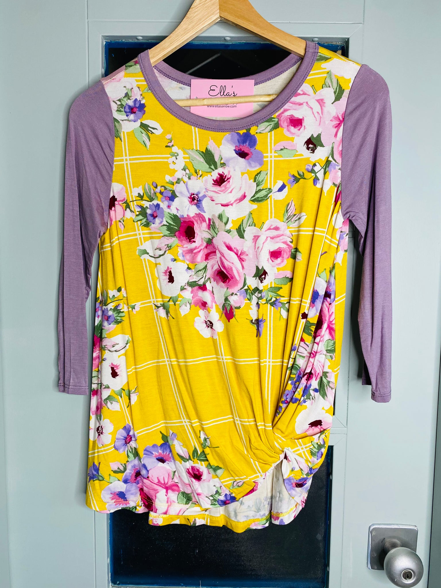 This cheerful floral number pairs a buttery mustard base with charming lilac sleeves for a color combo that just works. The fabric stretches and moves with you, while a playful twist detail at the hem adds personality to every wear. Proudly crafted right here in the USA, it's the kind of top that makes getting dressed actually fun.
